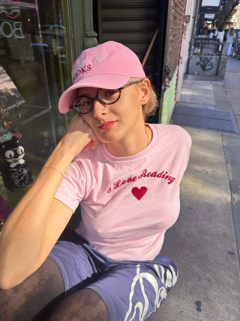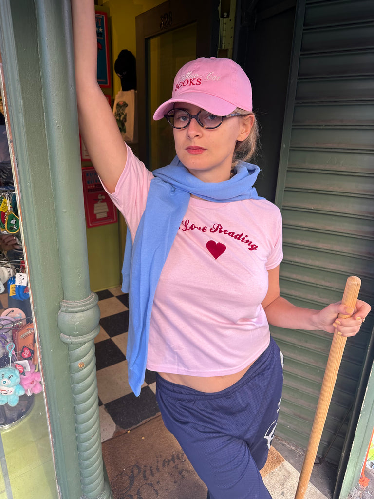 "I Love Reading" baby pink and red flock baby tee by Vanna Youngstein. Super cute, and intellectual T-shirt to wear everywhere!