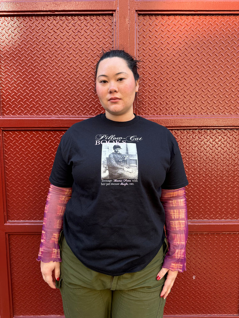 A special picture (from 1885!) of Beatrix Potter in her very own Pillow-Cat Books classic hat, printed on the perfect black tee. Wear her and her pet mouse Xarifa to all your fun holiday activities.